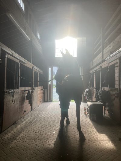 Our morning shift runs approximately from 7 AM - 11 AM. It includes feeding, turnout, stall cleaning, general barn chores.